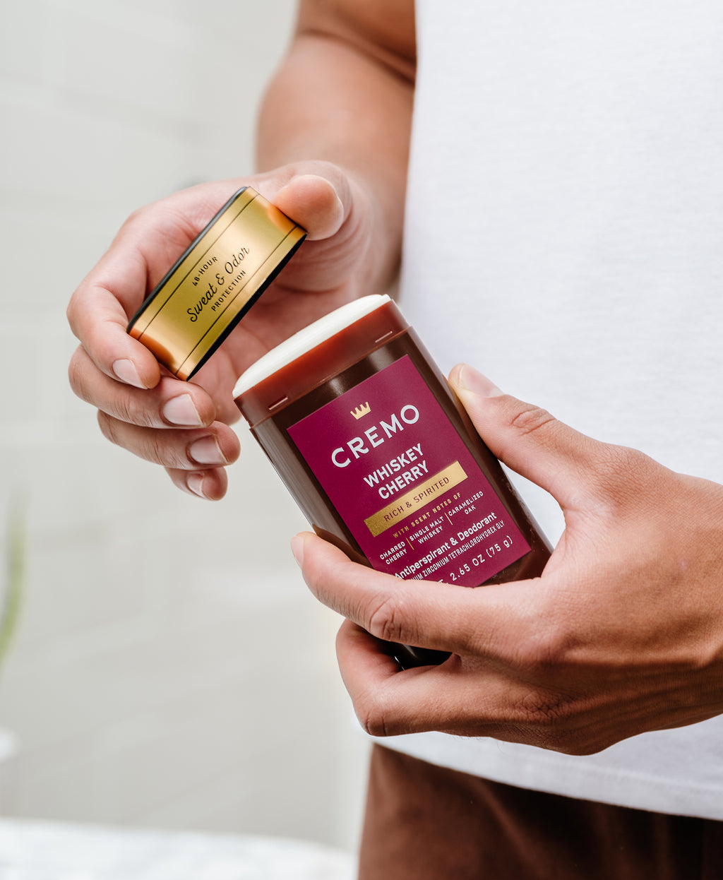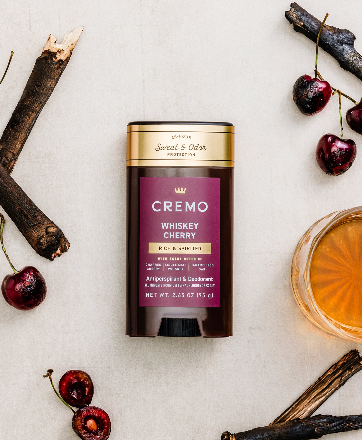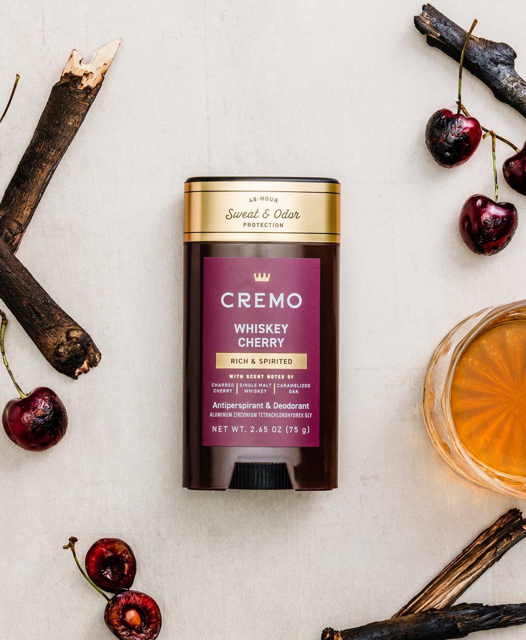 Our Whiskey Cherry Antiperspirant & Deodorant features a rich, spirited fragrance with notes of charred cherry, single malt whiskey, and caramelized oak. Enjoy long-lasting sweat protection that glides on smoothly, with our signature multi-layered fragrance that keeps you smelling fresh all day. Fresh and confident—unquestionably Cremo